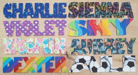 Unique to us, these names are made from 1.5mm Birch aircraftply (which is FSC certified as coming from sustainable woodland) and faced with a range of designs made from 100% cotton fabric. Each name is just seven inches long and 1 3/4 inches high. We usually have a wide range of designs in stock. Thin enough for a bookmark, big enough for a door and retailing at £4.00 each, they are affordable for all age groups and have proven to be an ideal stocking filler, parcel tag, or class gift.